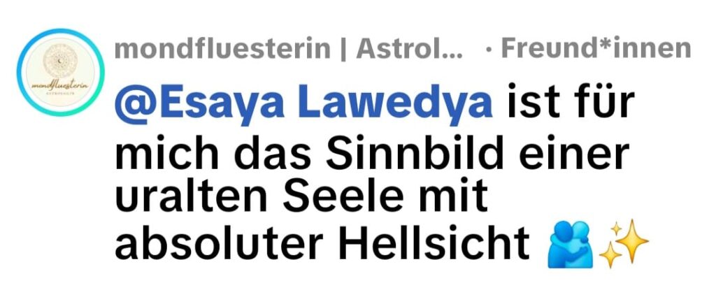 Liebe Esaya, ich bin dir soooo dankbar. Esaya, seit deiner Beratung geschieht so Vieles. Es ist mir so Vieles klar geworden. Puzzleteile kommen zusammen. All die Farben und Formen mit denen ich seit Kindheit „male“, meine Reisen und Kontakte zu den Tempeln der Meister (durch die gechannelte Bewusstseinschule von Sanaya Roman, mit der ich seit 1995 arbeite) und so weiter…und weißt du, was nun plötzlich ist? Ich kann mich nicht mehr an meinen alten Beruf erinnern?! Es gibt nur noch meine Lebensaufgabe… Wie das funktioniert weiß ich nicht, aber dass … Danke Esaya, dass du mich auf meinen Weg führst! Wünsche dir einen schönen Tag ❤️